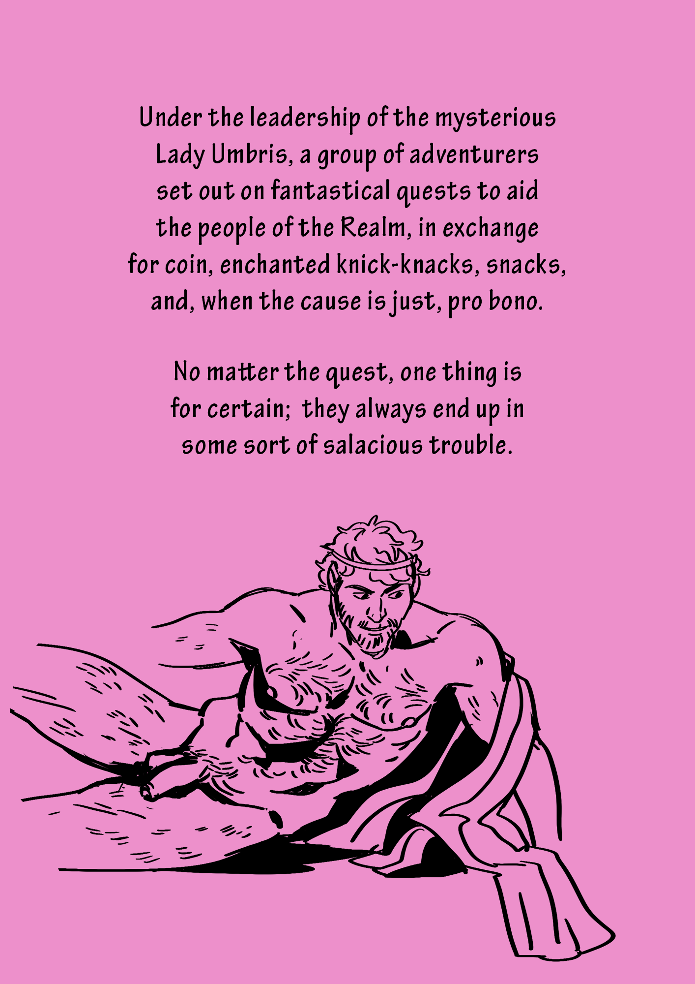 Under the leadership of the mysterious Lady Umbris, a group of adventurers set out on fantastical quests to aid the people of the Realm, in exchange for coin, enchanted knick-knacks, snacks, and, when the cause is just, pro bono.